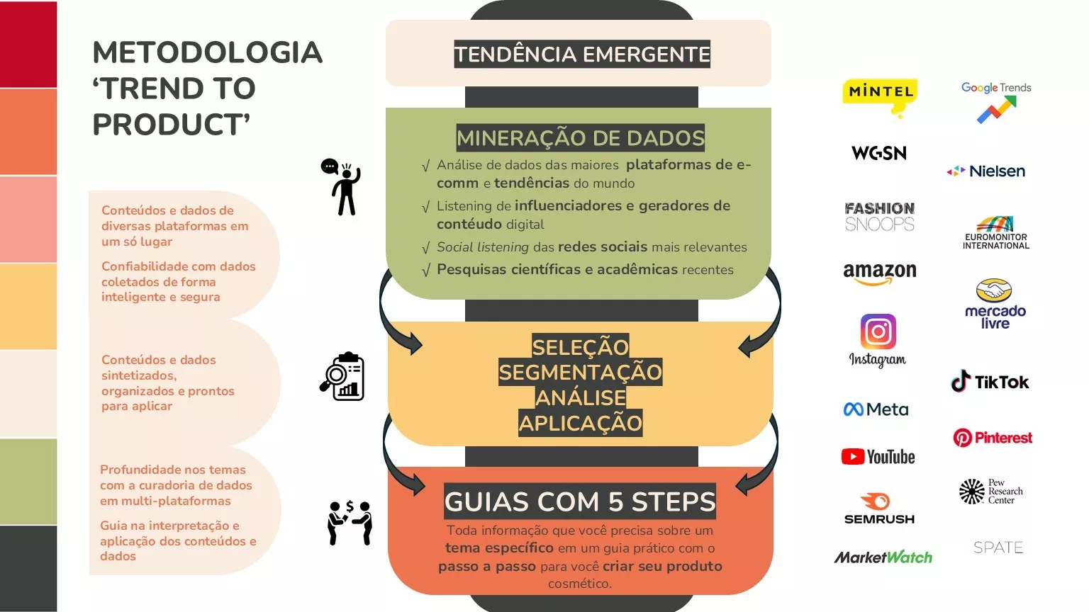 Criamos uma metodologia única de mineração de dados que organiza, sintetiza e segmenta informações de diversas plataformas de tendências, tornando insights complexos em direcionamento claro.